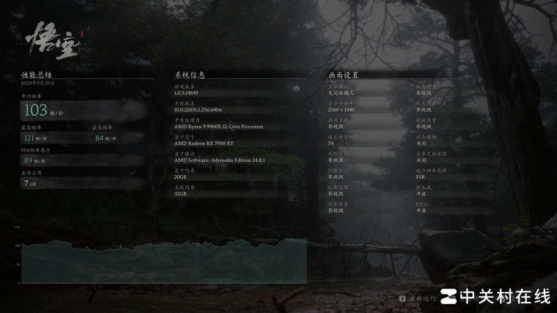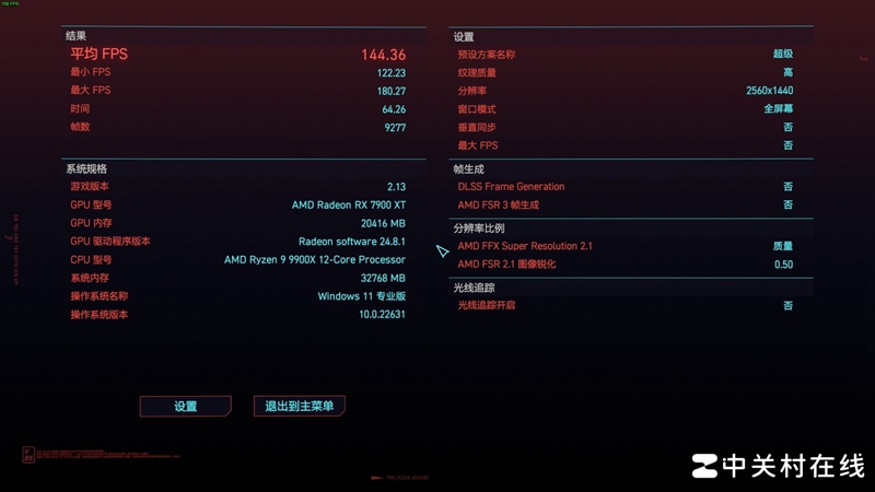 最后我们使用游戏测试一下华硕 X870E HERO主板平台高频开启AI超频后整个平台的稳定性,游戏选择《赛博朋克:2077》、《黑神话:悟空》,2077画质预设超高,黑神话画质影视级,FSR 75,分辨率为2K,使用游戏自带benchmark进行测试。