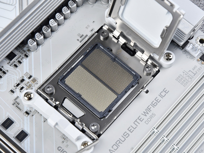 主板左上方为AM5处理器的插槽,支持7000/8000/9000系列处理器,周围配备了12+2+2相数字供电设计,单相输出电流达到60A,可以为CPU,核显提供稳定供电,确保其在高负载运行时的稳定性。