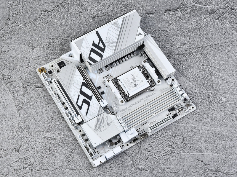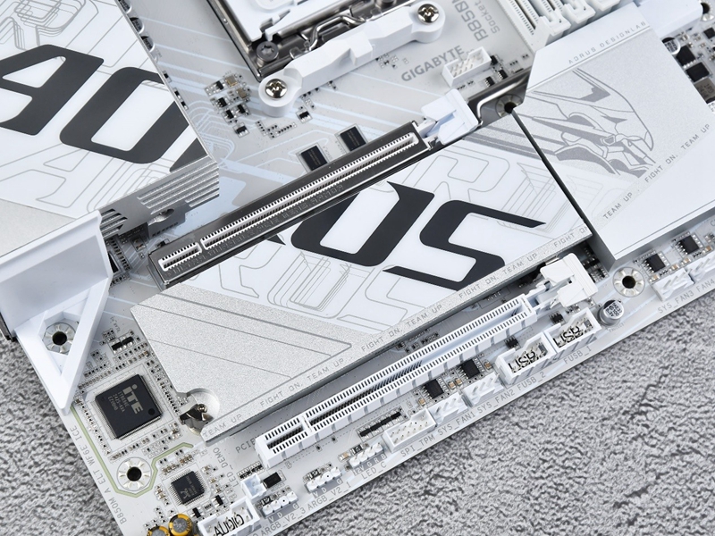 技嘉 B850M AORUS ELITE WIFI6E ICE主板采用白色和银色搭配的主色调,PCB板与散热装甲均采用了银白色设计,构建出高度统一的外观。主板的装甲区域与固态硬盘的装甲区域共同组成了AORUS的LOGO,设计极具潮流且酷炫。