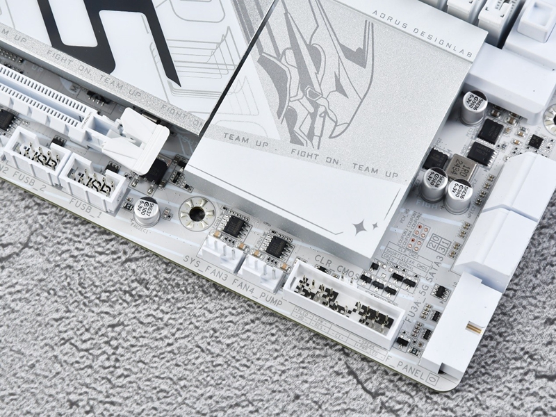 技嘉 B850M AORUS ELITE WIFI6E ICE主板背部同样很有设计感,整齐的电路和元件让人赏心悦目,左下角动感的AORUS字样融入team up,fight on的标语中,外侧还丝印了一圈AORUS的字样。