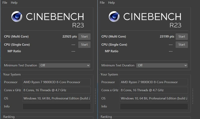 接下来是CineBenchR23的成绩,CPU的多核成绩从22925分提升至23199分,虽然提升的幅度不大,不过对于用户来说进行简单设置就能获得性能提升还是非常有价值的。