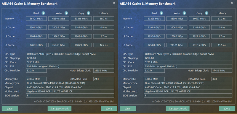 我们先使用默频进行测试,随后开启XMP/EXPO功能,将内存提升至DDR5 7000MT/s进行对比。
