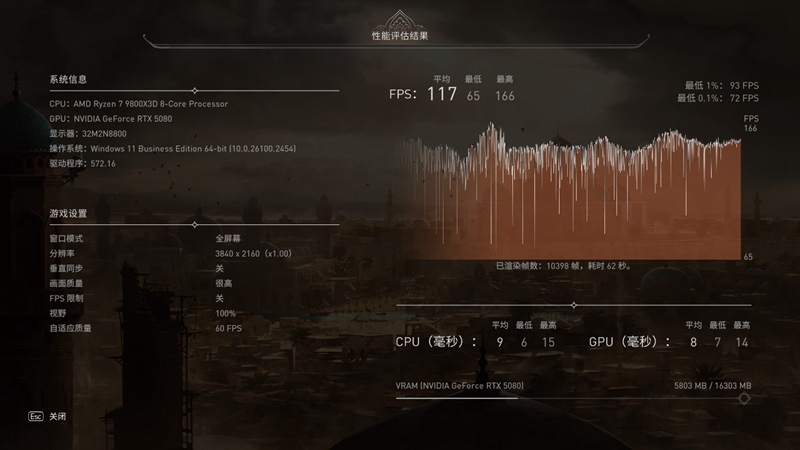 在《刺客信条:幻景》的游戏测试中,在4K分辨率,超高画质下,技嘉 B850M AORUS ELITE WIFI6E ICE搭配9800X3D及RTX 5080取得117fps的平均帧数。