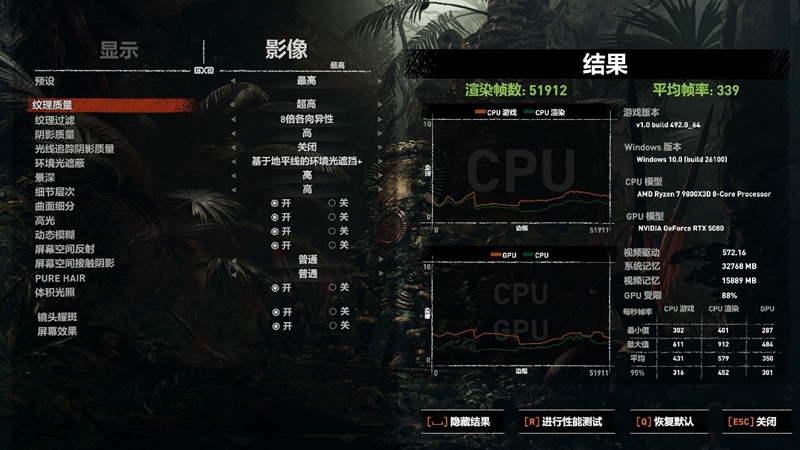 在《古墓丽影:暗影》的帧数测试中,设置最高画质,4K分辨率,技嘉 B850M AORUS ELITE WIFI6E ICE平台拿下了339fps的好成绩,同样把硬件的性能发挥得淋漓尽致。