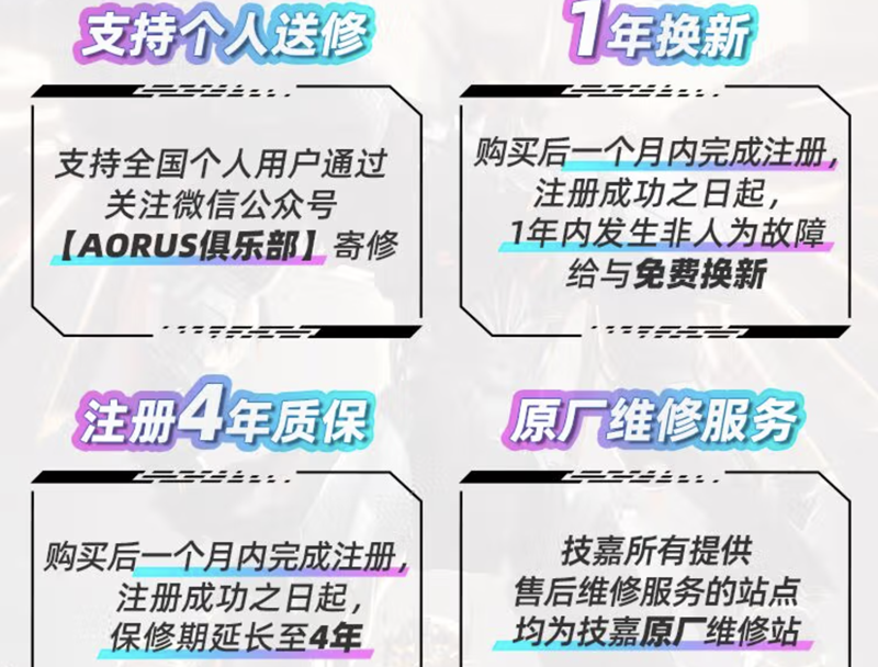 此外,技嘉 B850M AORUS ELITE WIFI6E ICE主板还提供了4年质保、1年换新、个人送修以及人损帮修等贴心服务,让玩家在使用过程中更加安心。