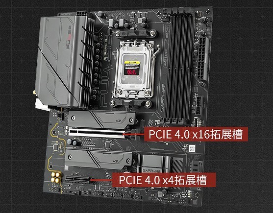 在用户关注的拓展性上,蓝宝石 B850MP WIFI主板提供双PCIe拓展槽:首条全长PCIe 4.0x16插槽支持AMD RX 9000/6000系显卡满速运行;第二条开口式PCIe 4.0 x4插槽则完美兼容万兆网卡、高性能声卡等扩展设备。此外,双M.2散热片设计、前置3个5V ARGB接口、5个可调速风扇接针,让用户在组建RGB灯效系统或搭建高速存储方案时拥有更多选择空间。