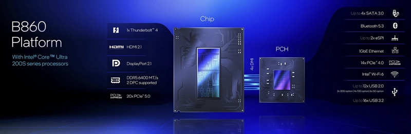 评测之前我们首先针对新发布的B860芯片组以及酷睿Ultra 200S非K系列处理器进行介绍,咱们先来看一下B860芯片组。