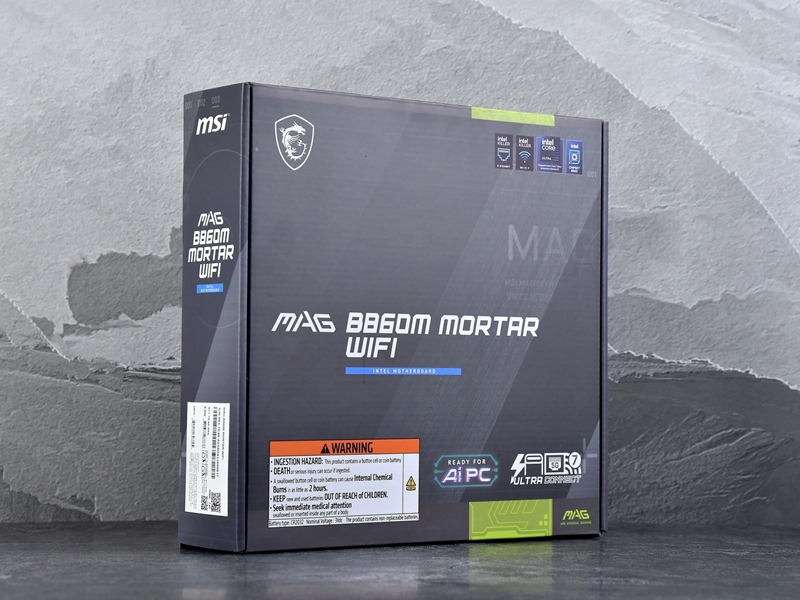 在拿到微星 B860M MORTAR WIFI迫击炮后笔者就觉得这次迫击炮不一样了,外包装风格更为简洁,相较于之间几代删去了主板的剪影,并且透露这款主板的一些重要参数比如雷电4和Wi-Fi 7的标志。