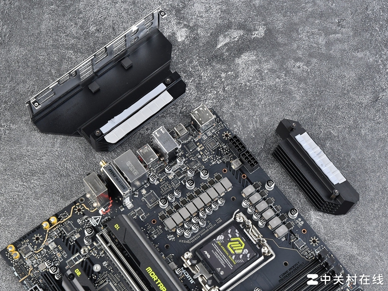 除了智能的SPS供电设计,微星MAG B860M MORTAR WIFI迫击炮主板VRM散热装甲也就保持高规格用料,由两个厚实的金属散热片组成,底部配备导热垫覆盖主MOS这种重要发热源,让供电在高压负载下可以长时间稳定运行。