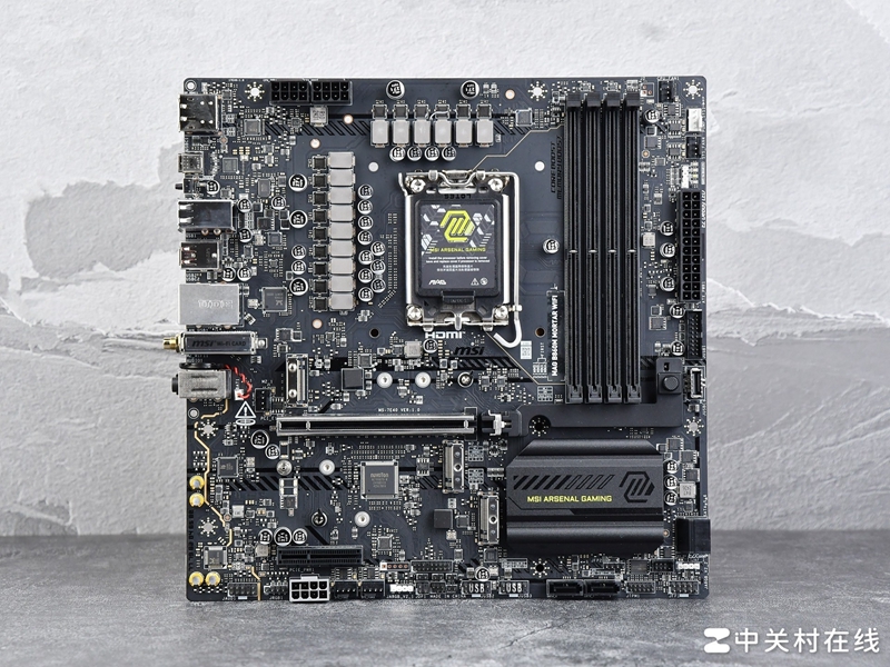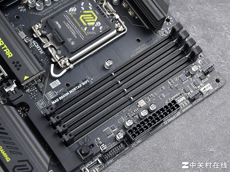 开箱之后的微星 B860M MORTAR WIFI迫击炮也出人意料,首先是配色方面,没有使用这两代主流的白色装甲,也没有使用更早的黑灰色,而是使用与自家MEG系列接近的纯黑配色,搭配相同的明黄涂装纹理,减少了柔美的视觉效果,增加了神秘和力量的感觉,展现出了传统配色与创新风格之间艺术气息,远看跟个小战神主板一样。