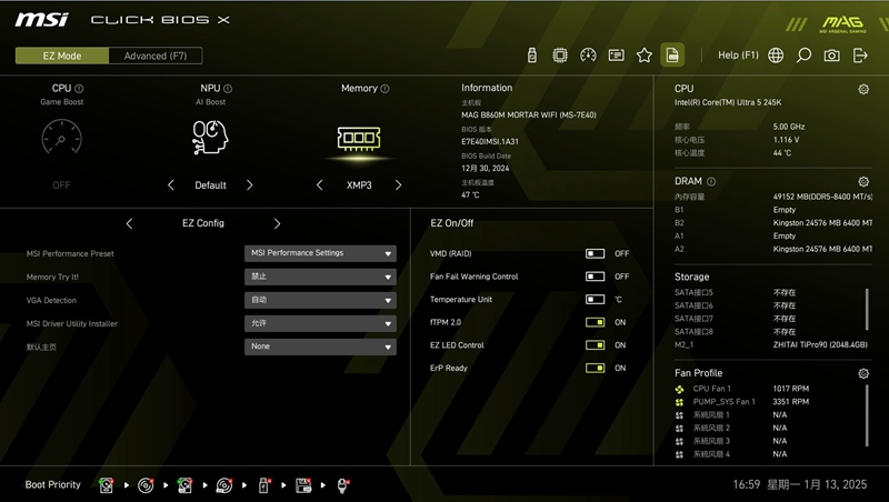 首先来到EZ MODE主菜单,微星简洁明了的在主菜单中标注了各项信息,以及重要功能的快捷设置,不如NPU加速、XMP等功能,CPU因为B860芯片组锁倍频,多以没像Z板一样提供游戏超频模式。而相较于最早版本的BIOS,微星在这个EZMODE主菜单界面中下方EZ Config选项中增加了一个默认主页子项,大家可以根据需求调整进入BIOS中的主页,不用局限于EZ MODE界面。