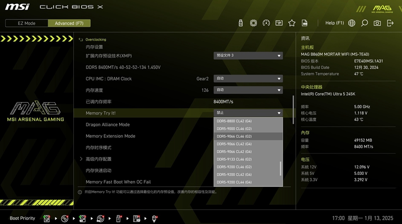 而除了针对性能预设模式外,对于Memory Try It!我们也进行了测试,看一看微星MAG B860M MORTAR WIFI迫击炮主板的内存超频性能。