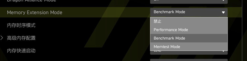 往下来到了内存相关的设置界面,也可以在这里开启XMP。微星针对内存在BIOS中做个两个特别技术设计,一个是Memory Try It!,另一个是性能预设模式(Memory Extension Mode)。