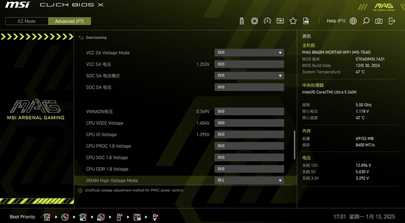 微星MAG B860M MORTAR WIFI迫击炮主板搭载了目前微星主板的全新BIOS,UEFI风格大变,更符合当下用户的使用习惯以及操作逻辑。