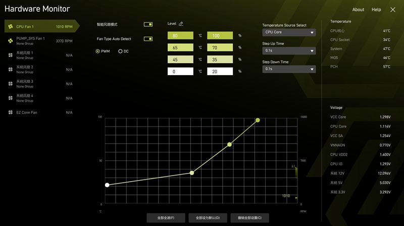 M-FLASH的旁边就是微星的Hardware Monitor温空调界面,可以调节风扇相关设置,包括PWM和DC。