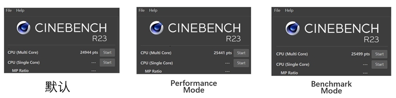 可以看到相较于AIDA64,CINBENCH R23也有提升,不过幅度会更小一些,尤其是Performance Mode档位和Benchmark Mode档位,基本没有什么差别。