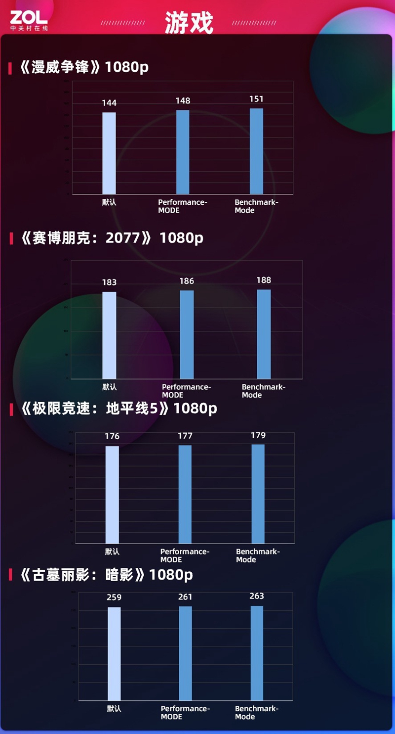 下面我们在通过游戏进行实测,看看三个档位之间的游戏帧数差异,测试的游戏为《赛博朋克:2077》、《古墓丽影:暗影》、《漫威争锋》以及《极限竞速:地平线5》,分辨率为1080p,画质为预设最高。