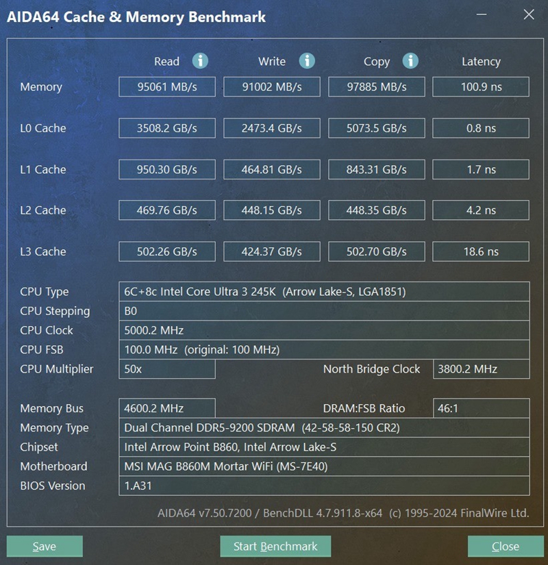 此时内存读取成绩为100.05GB/s,写入为94985MB/s,复制为97780MB/s,延迟88.3ns。下面我们开启微星MAG B860M MORTAR WIFI迫击炮主板BIOS里性能预设模式(Memory Extension Mode)中的Performance Mode档位,看看这套内存读写的变化。