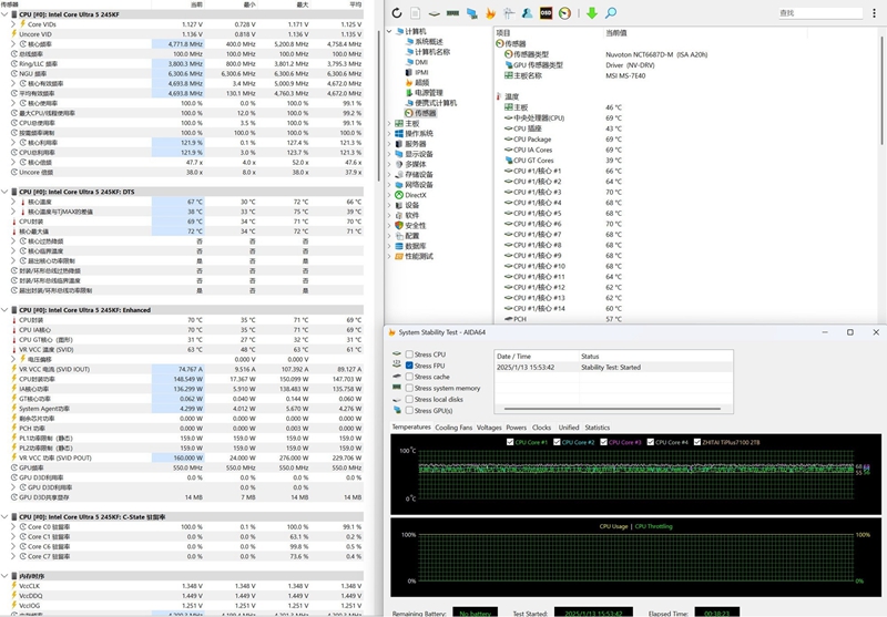 拷机测试结果来看Ultra 5 245K对于微星MAG B860M MORTAR WIFI迫击炮主板没有任何压力,在这款主板上这款U在FPU拷机情况下平均功耗就在150W左右,开启MSl Unlimited Settings档位也是如此,封装温度也只有70℃左右。在大部分情况下,这款主板搭配Ultra 5 245K处理器使用常规风冷即可压住,无需高规格散热器。