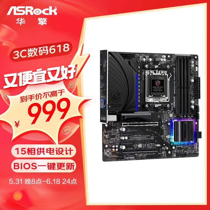京东华擎 B650M PG Riptide 黑潮风暴 M-ATX主板推广活动已经开始,原价1099元的产品现在只需899元就可以获得。下单时可以获得980元减80元、200元减20元的优惠券,大大降低了购买成本。