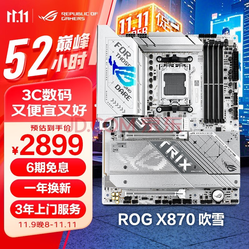 另要特别推荐下吹雪家族的新成员――华硕ROG X870吹雪主板(ROG STRIX X870-A GAMING WIFI)。除了身披大面积银白色机能战甲外,较上代ROG X670E吹雪主板,还将PCB也变为白色,另颜值达到新高度。超大的I/O盔甲上也有RGB灯效,支持神光同步,呈现流光溢彩的视觉效果。目前售价2899元,华硕商城晒单返100元,购买链接:立即前往,京东商城可享6期免息,购买链接: