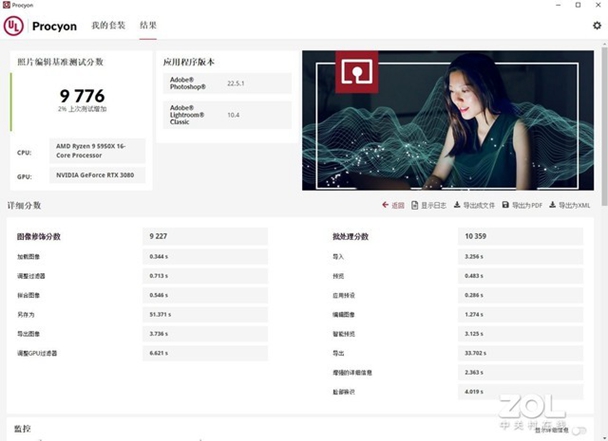 我们首先使用UL Procyon进行测试,是这款专门针对生产力应用软件的Benchmark测试程序,这款应用软件会使用Adobe Photoshop和Lightroom Classic进行跑分,涵盖图片的导入求出,处理滤镜,合并图层、批处理等内容,基本把大量消耗计算量的项目都检验了一遍,最后得出打分。
