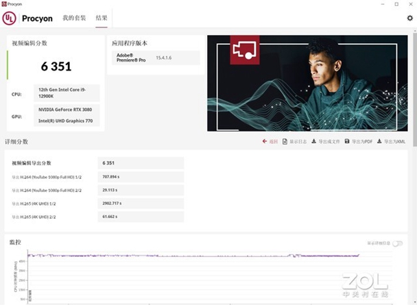 UL Procyon还可以测试视频编辑,主要使用Adobe Premiere Pro对H.264及H.265代码的1080p和4K视频分别进行输出,检验视频求出的效率,最后得出打分。前几代Adobe Premiere Pro对AMD处理器并不友好,不过与PS一样,这款旧版Adobe Premiere Pro也对AMD处理器进行了多核优化,如今在PR剪辑上AMD已不再是强势项目。