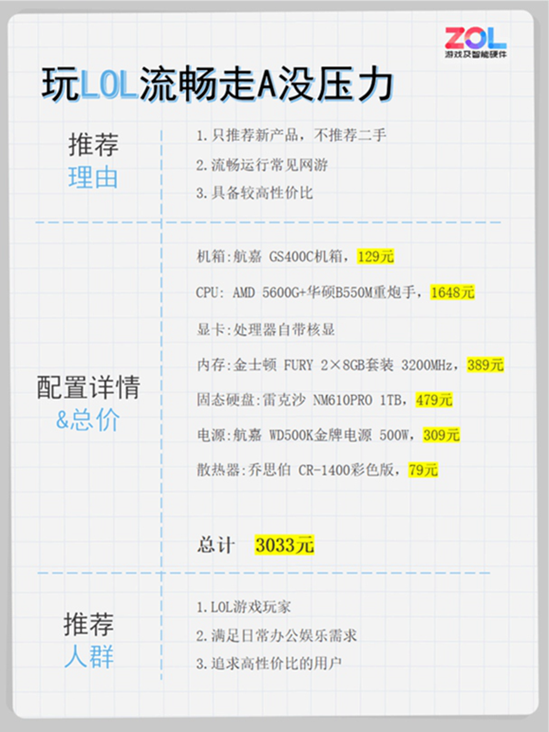 LOL作为一款受众广泛的MOBA竞技游戏,对主机的配置要求并不高,目前的主流核心显示器可以满足流畅运行的需求。在AMD瑞龙55600G的基础上,笔者3000元主机配置,同时采用了高功率的电源,可以满足玩家增加入门级游戏图形卡的供电要求。想省钱的朋友可以参考一下。