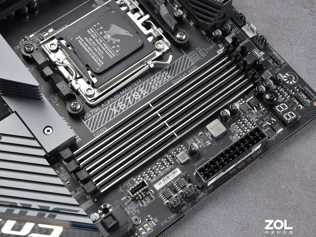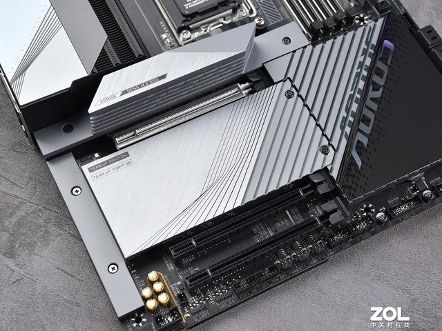 在展会上,技嘉 X670E AORUS MASTER超级雕刻主板共有4组M.2插槽,前两个支持PCIe5,直接连接CPU,另外两个是PCIe4.0带宽。