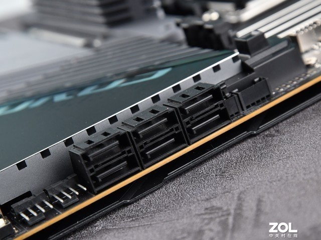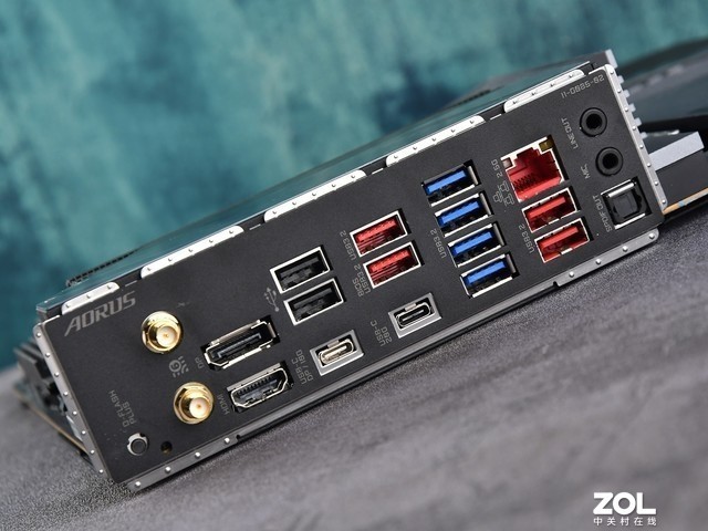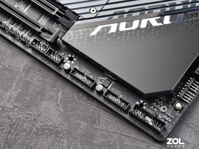 散热片上方是带有AORUSLOGO的I/O装甲,LOGO带有RGB光效。
