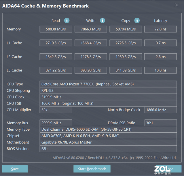 最后,我们使用AIDA64进行复制测试,看看瑞龙77700X的温度性能如何,然后使用普通风冷。