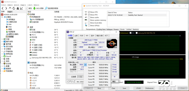 这一代瑞龙7000的功耗和温度确实增加了不少,但在技嘉 X670E AORUS MASTER超级雕刻主板上,瑞龙77700X使用普通空气冷却,温度保持在95℃左右,中间没有降频等不良反应,主板温度非常低,说明在CPU高压的情况下,CPU仍能稳定输出电流。