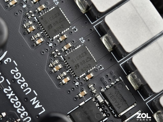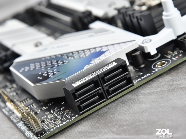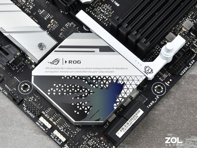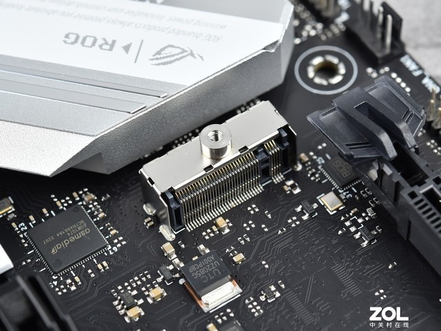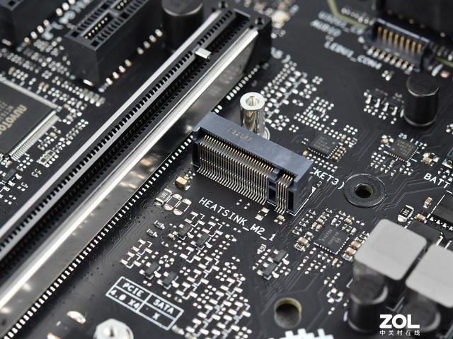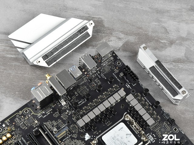 有两个M.2插槽,全部支持PCIe4.0,配有金属装甲散热器,顶部直接连接CPU,另一个采用PCH。两个M.2插槽都采用了无螺丝安装设计。