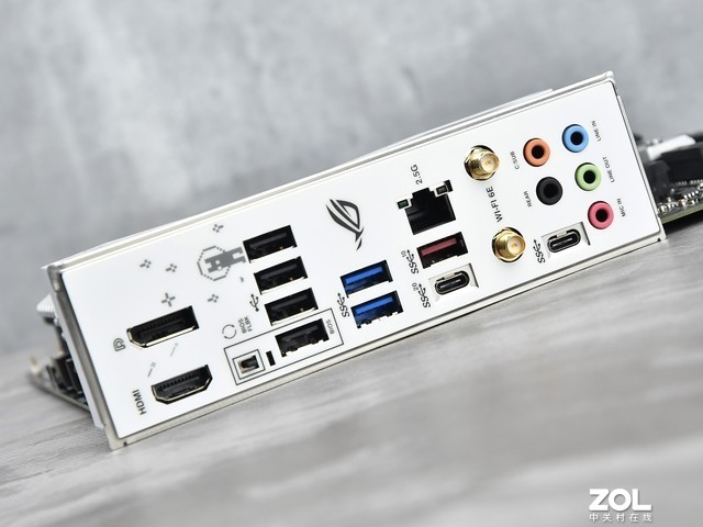 白色I/O挡板预装在I/O区域华硕 B760-G GAMING WIFI D4主板上,提供一个HDMI接口,一个DP接口,四个USB2.0接口,两个USB3.2GEN1TYPE-A接口,一个USB3.2GEN1Type-C接口,一个USB3.2GEN2接口,一个USB3.2GEN2x2Type-C接口。并配备2.5G有线网卡和WIFI6E天线网口。
