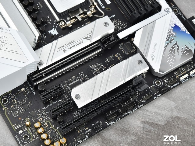 除了PCIe4.0x16外,华硕 B760-G GAMING WIFI D4主板还有两个PCIex16插槽,最上面的带宽是PCIe5.0x16带宽,下面的带宽是PCIe4.0x4带宽,还有两个PCIe4.0x1短插槽。