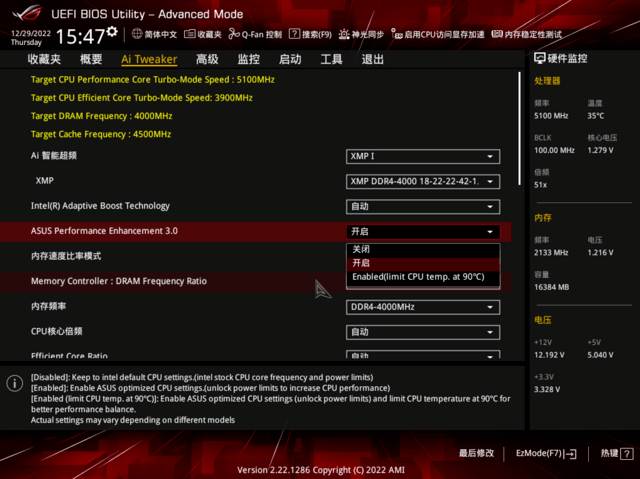该主板在BIOS中自带华硕PerformanceEnhancement3.0技术,简称APE3.0,该技术开启后可实现CPU多核心效率增强,解锁功耗限制,CPU的LoadLineAC/AD开启后会自动调整,用于降低CPU的功耗和温度,同时支持90摄氏度功耗墙锁定,对高级处理器来说更为关键,有效降低温度。