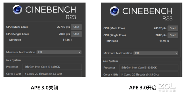 在华硕APE3.0开启前后,CINEBENCHR23多线程跑分变化十分明显,酷睿i5-13600K增加了5%左右,大大提高了该处理器的性能上限。