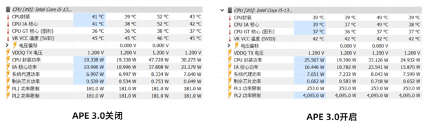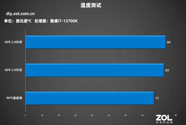 在APE3.0开启前后,酷睿i7-13700K仍然只有1℃的差距,但打开温度墙后,CPU温度下降到77℃,足足有6-7℃的差距,这对高端处理器来说无疑是非常有效的。