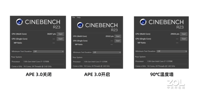 当然,在性能方面,虽然开启90℃温度墙降低了功耗和温度,但实际上并不影响处理器的性能。我们继续测试CINEBENCHR23,看看酷睿i7-13700K在三个选项下的多线程性能。