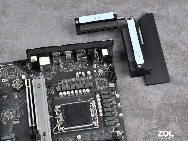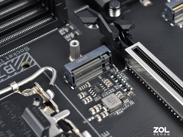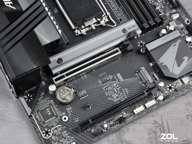 有两个M.2插槽,全部支持PCIe4.0,最上面直接连接到CPU的M.2插槽配有金属散热器,同时两个M.2插槽均采用M.2EZ-LatchPlus设计,支持免螺钉安装。