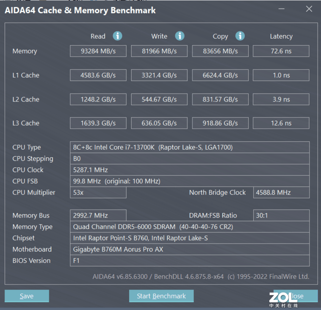 在技嘉 B760 小雕 AX主板上,6000频DDR5内存读取速度高达93284MB/s,写入81966MB/s,这种读写表现的确远远超过DDR4内存,适合要求较高的用户。