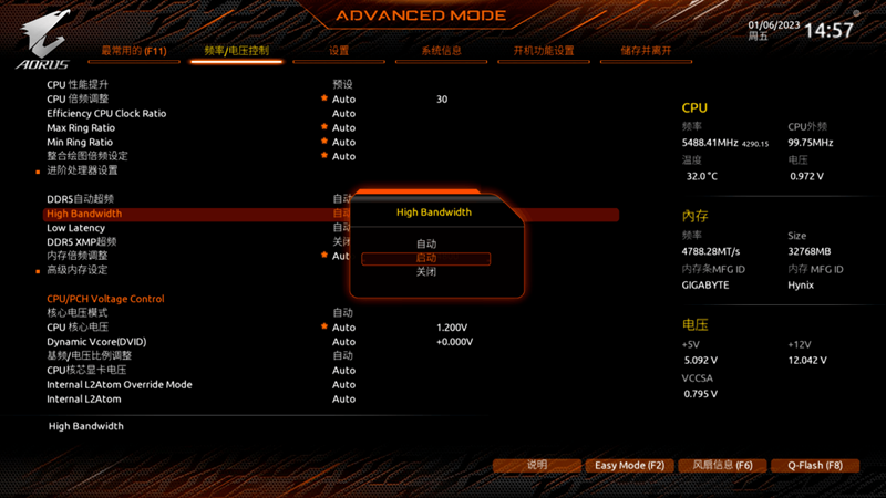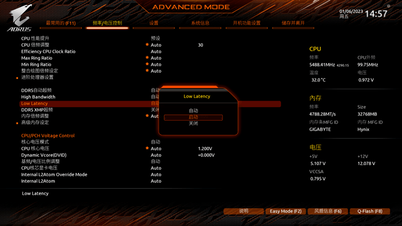 开启这项技术也很简单,因为技嘉主板现在已经有了非常成熟的中文图形化BIOS界面,调整方面。进入BIOS按F2进入高级模式,打开XMP或EXPO就足够了,可以看到LowLatencySupport和XMP/EXPOHighBandwidthSupport这两个选项,Enabled分别开启了低延迟、高带宽的技嘉主板内存模式。