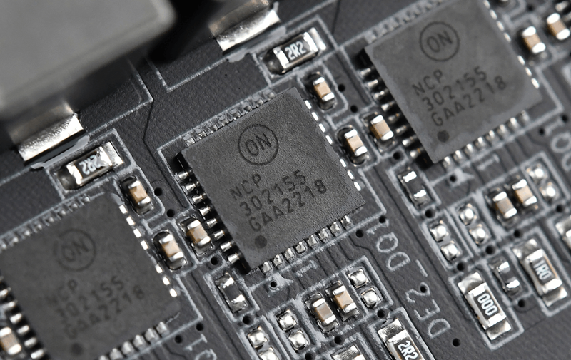 该主板14相核心电源均采用DrMOS设计,型号NCP302155,可单相输出60A电流,配合8+4pin实心电源接口设计,理论上可应付酷睿i9级13代酷睿电源输出。
