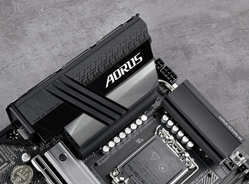 技嘉 B760电竞雕塑PROAX主板供电强劲,散热能力也很强。VRM散热装甲非常厚实,超大的金属散热器配有6毫米热管,可以快速帮助供电区传递热量,保证稳定的供电输出。
