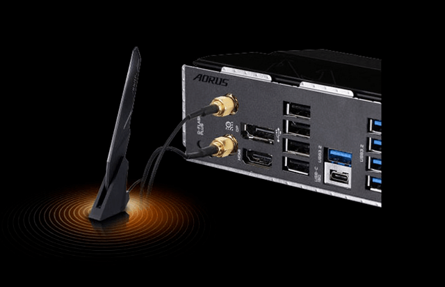 技嘉小雕AX B650M AORUS ELITE AX主板提供2.5G和Wi-Fi6E无线网络,配件还配有信号增强天线,即使在复杂的多用户环境中,也能提供更可靠、更高效的网络环境,为用户带来极快、畅快的网速体验,