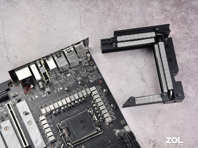 这个主板的散热器非常重,由导热铜管连接,底部覆盖着大量的导热垫,快速传递Dr.Mos热量。