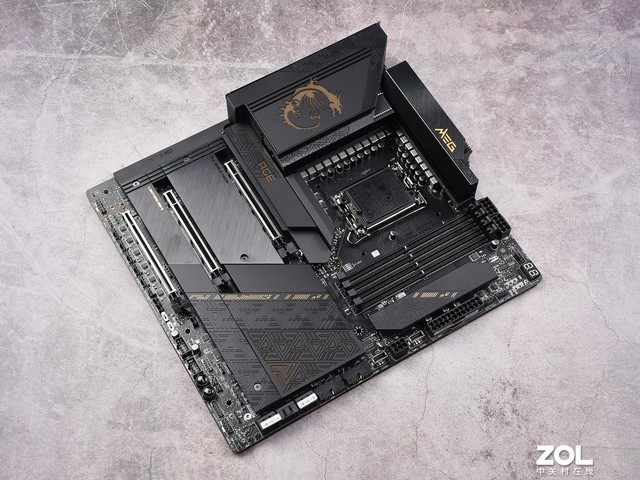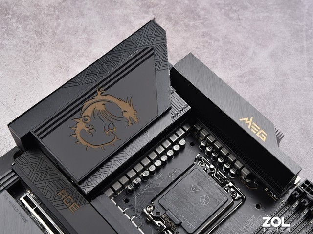 VRM散热器的顶部是带有微星龙纹LOGO和灯光效果的I/O盔甲。LGA1700仍然是这一代的主板插槽接口,可以与13代和12代酷睿处理器兼容。