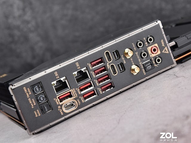 微星 Z790 ACE战神主板预装了I/O挡板,提供了8个USB3.2Gen2接口,其中7个是TYPE-A,另一个是TYPE-C。另外还有两个雷电4接口,传输速度高达40Gb/s,并且可以支持8K视频输出。此外,该主板还提供了两个MiniDP视频接口,双2.5G网口和WIFI6E天线接口。