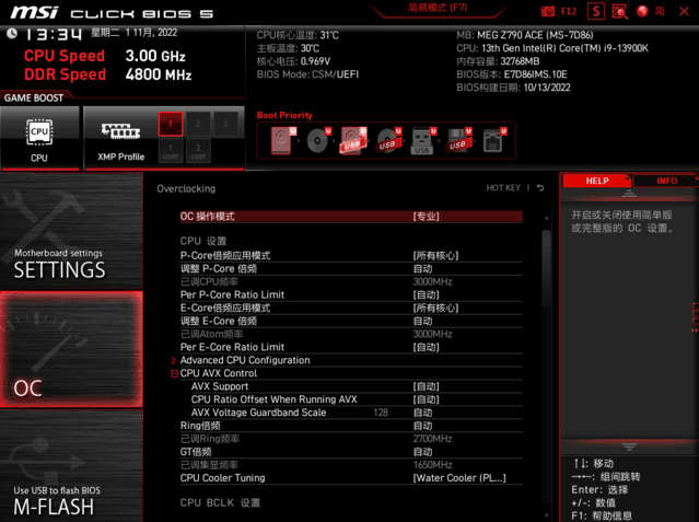 以下是微星 Z790 ACE战神主板的BIOS,依然是熟悉的风格画面,主菜单集成了XMP、CPU等GAMEBOOST一键超频等常见功能。XMP建议无脑打开,CPU游戏模式要慎重考虑,在散热到位的情况下性能和提升,但是平台压力太大,风扇噪音也很大,对高端平台的收益也很小。