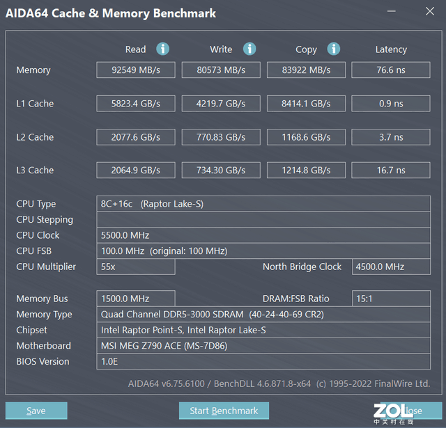 与上一代相比,这一代DDR5内存的读取性能要好得多,6000MHz频率的内存读取量突破9W,写入量也达到8W,因此13代平台的整体性能大大提高。